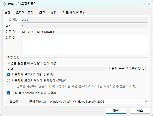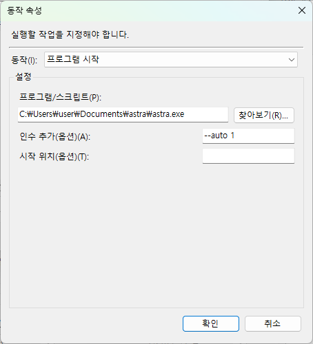 프로그램 항목에는 Astra를 설치한 경로를 입력합니다.