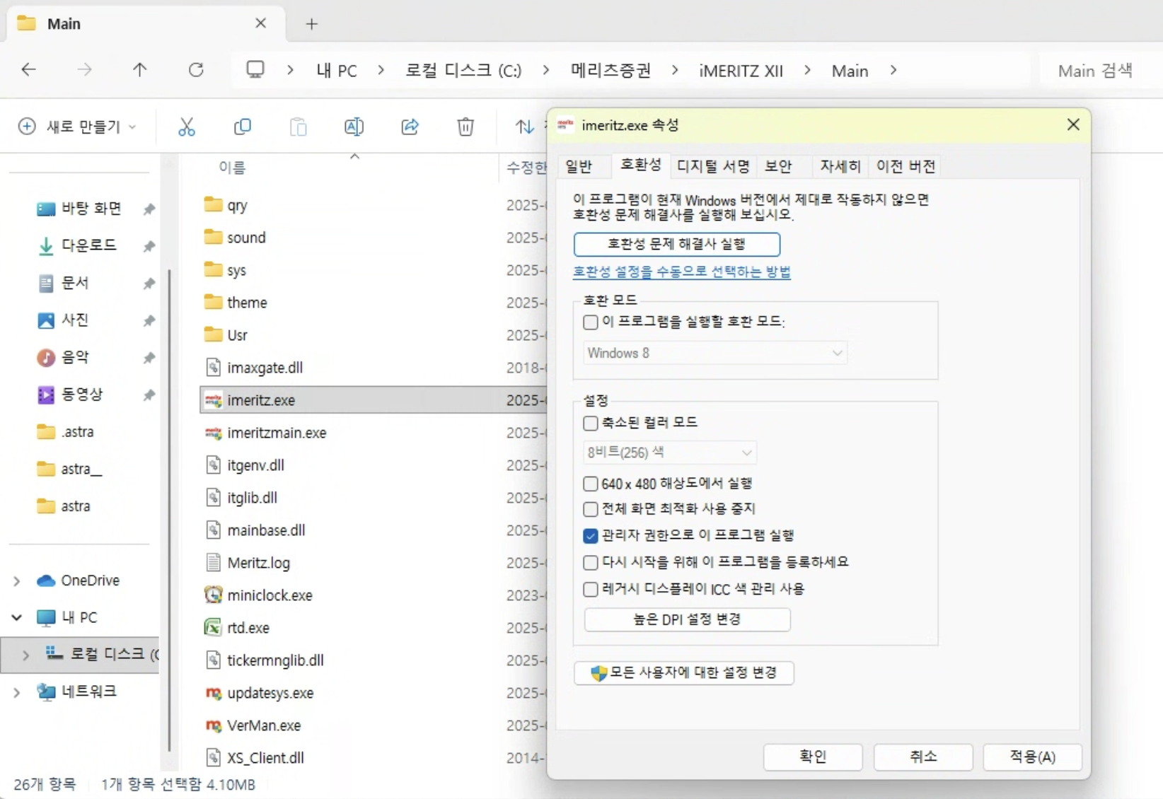 내 PC > C: > 메리츠증권 > iMeritz XII > Main으로 이동합니다. imeritz.exe에서 마우스 오른쪽 클릭 > 속성 클릭- 호환성 탭에서