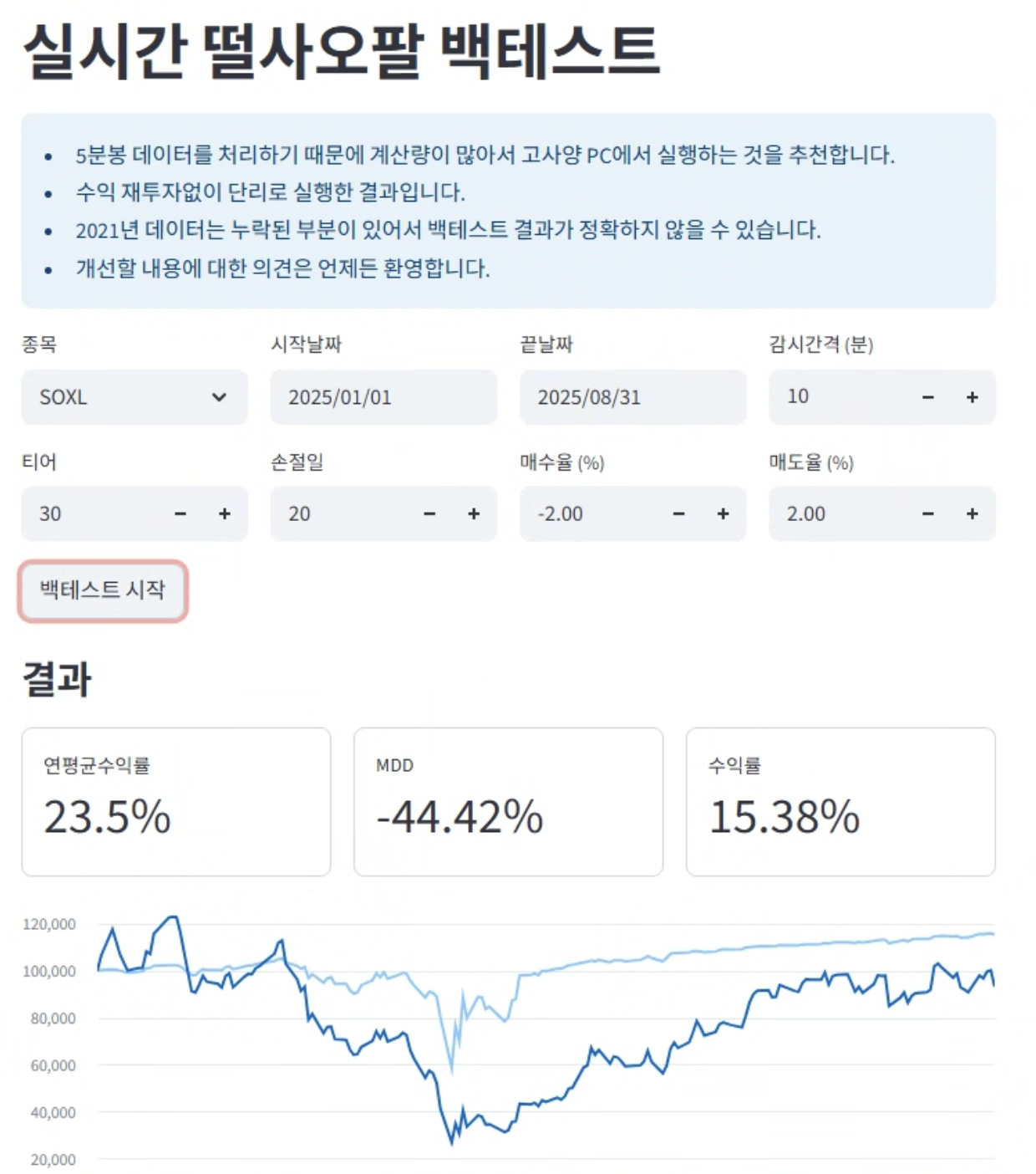 실사오팔 파라미터를 결정하는 데 도움이 될 수 있도록 과거 데이터로 백테스트를 수행하는 프로그램을 제작했습니다.