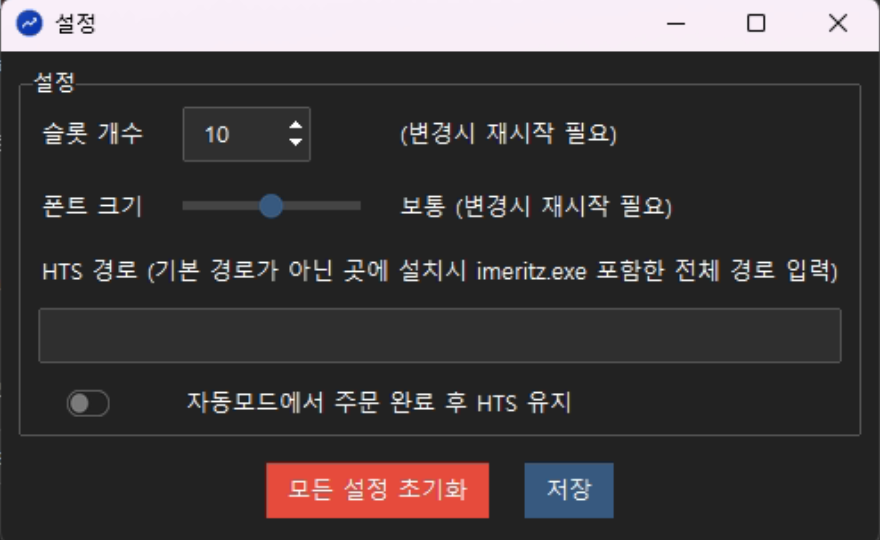 | HTS 경로 | HTS 를 기본 경로에 설치하지 않은 경우에, 설치한 경로를 입력합니다. C드라이브 용량 문제로 다른 드라이브에 설치한 경우에 사용할 수 있습니다. imeritz.exe 를 포함한 전체 경로를 입력합니다. |